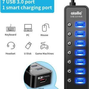 Equipped with individual on-off switches to control each USB port, atolla USB 3.0 hub saves the trouble of unplugging devices and help place them more rationally when you don’t use them.